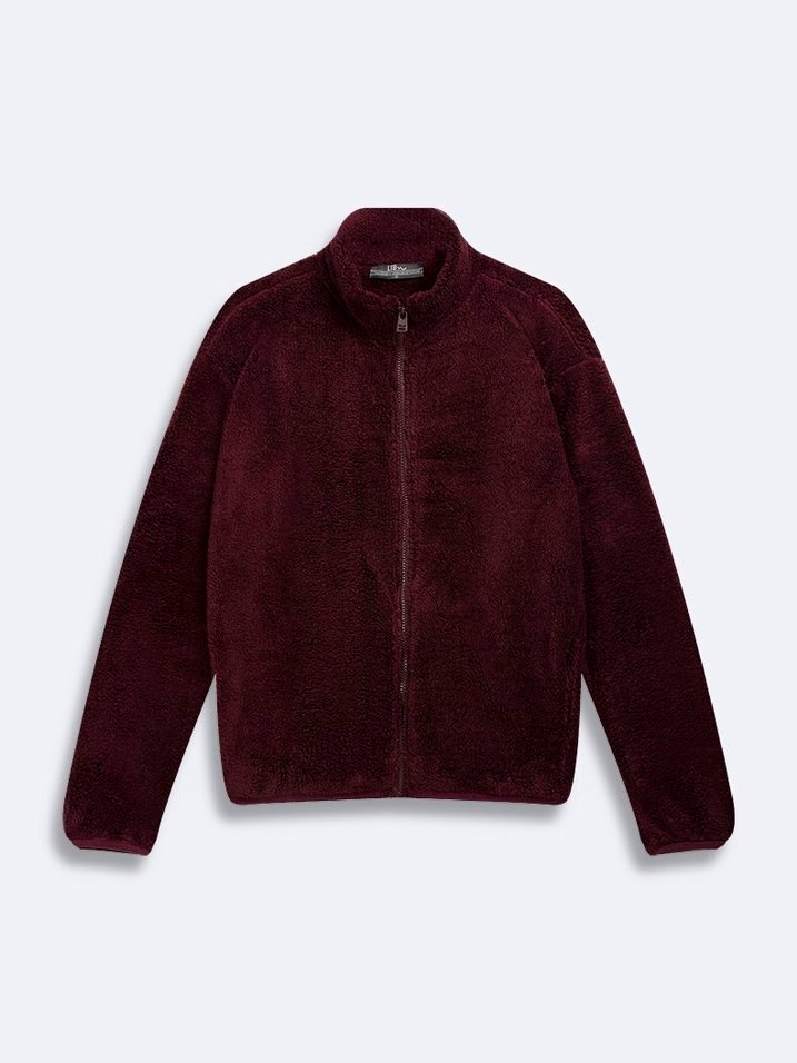 Bordo renkte, uzun kollu, fermuarlı ve bisiklet yaka kadın sweatshirtü. Yumuşak, sıcak kumaştan, sade ve rahat bir sokak stili sunar.