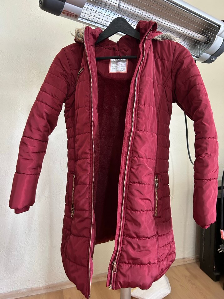 Bordo renkli, fermuarlı ve uzun kollu çocuk kışlık mont. Yumuşak ve sıcak tüylü kumaştan, günlük kullanıma uygun, dar kesim ve notched yakaya sahip.