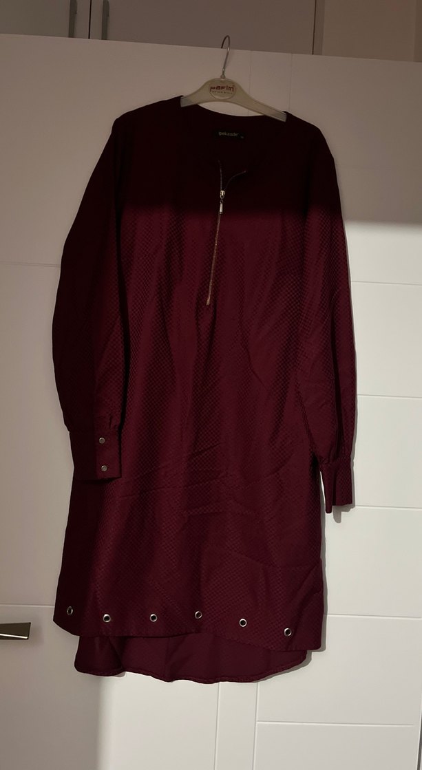 Bordo renkli, fermuarlı önü ve uzun kollu, notched lapel yakalı kadın midi tunik. Sentetik kumaştan, bol kesim ve minimalist sokak stiliyle günlük kullanıma uygun.
