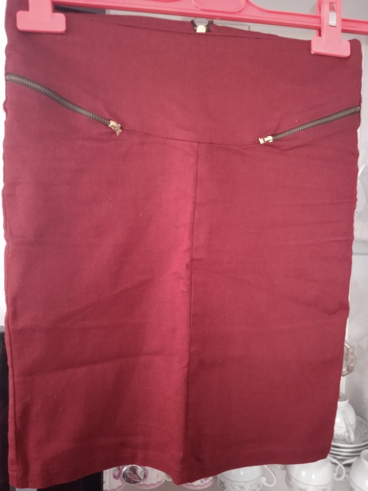 Bordo renk, fermuarlı ve parlak görünümlü, sentetik kumaştan yapılmış, dar kesim mini etek.