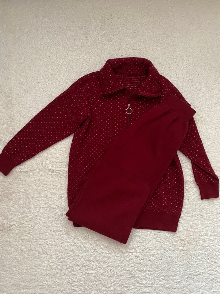 Bordo renk, düğmeli ve cepli, notched lapel yakalı, uzun kollu, rahat kesim kadın eşofman takımı. Yumuşak ve sıcak kumaştan, günlük kullanıma uygun.
