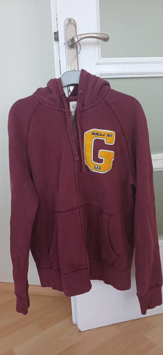 Bordo renkli, fermuarlı sweatshirt, bol kesim ve uzun kolludur. Yumuşak, sıcak kumaştan üretilmiş, göğüs kısmında sarı "G" patch detayı vardır.