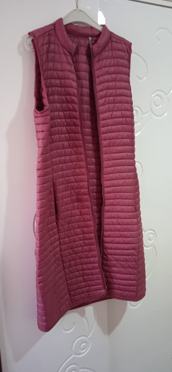Bordo renkli, fermuarlı ve uzun kesim kadın yelek. Yüksek yakalı, kolsuz ve vücuda oturan tasarımıyla rahat ve şık bir görünüm sunar. cebinde deforme var tamir edilebilir