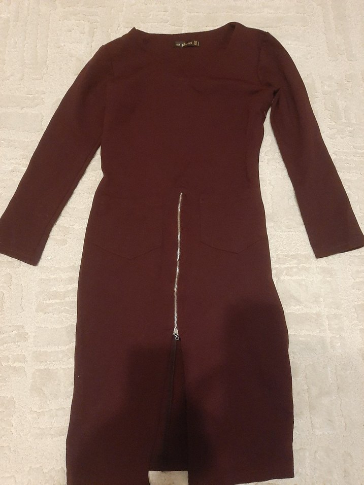 Bordo renk, V yaka ve uzun kollu, fermuarlı uzun boy elbisedir. Sentetik kumaştan olup minimalist ve sokak modasına uygundur.