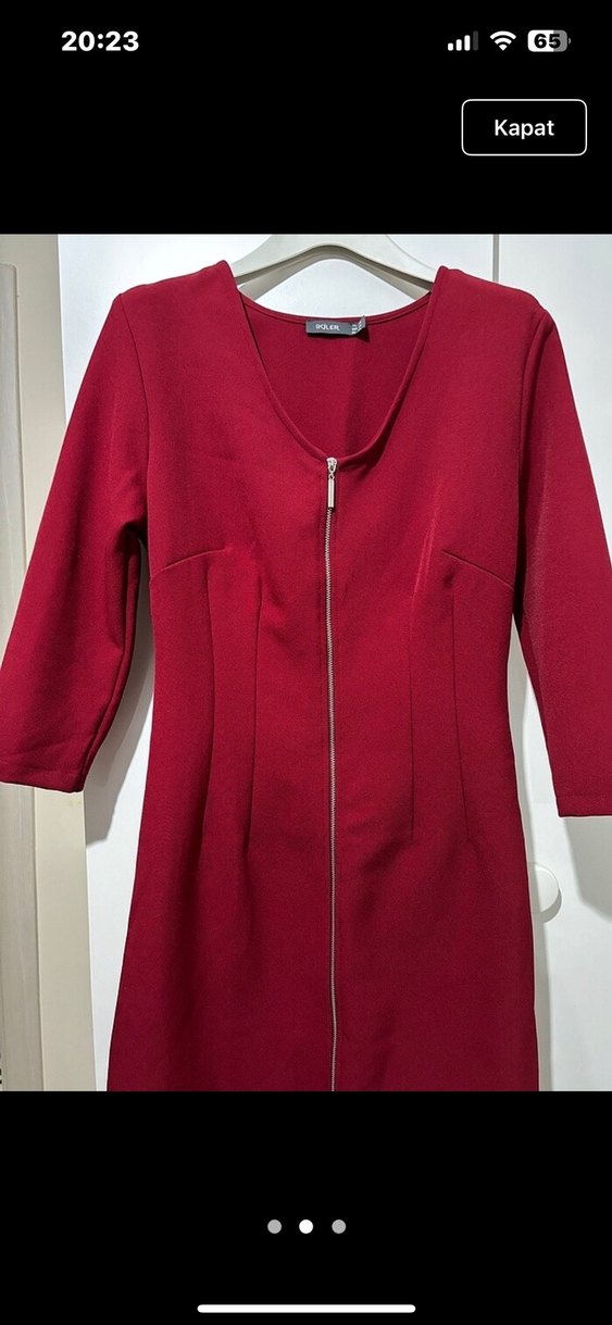 Bordo renkli, uzun kollu, V yakalı ve fermuarlı kalem elbise. Modern klasik tarzda, ofis için uygun, sentetik kumaştan yapılmıştır.