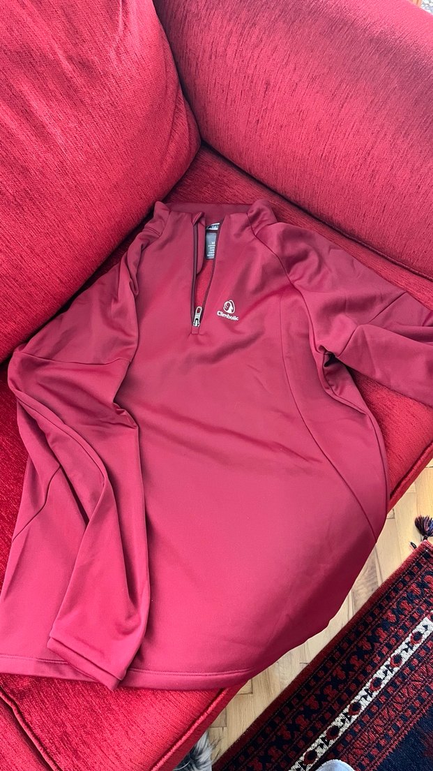 Fermuarlı önü ve yüksek yakası olan, bordo renkli, yumuşak ve sıcak kumaştan üretilmiş dar kesim sweatshirt. Uzun kollu ve baskılı, günlük rahat kullanım için uygun. İçi polarlıdır. S-M uygundur. Oversize.