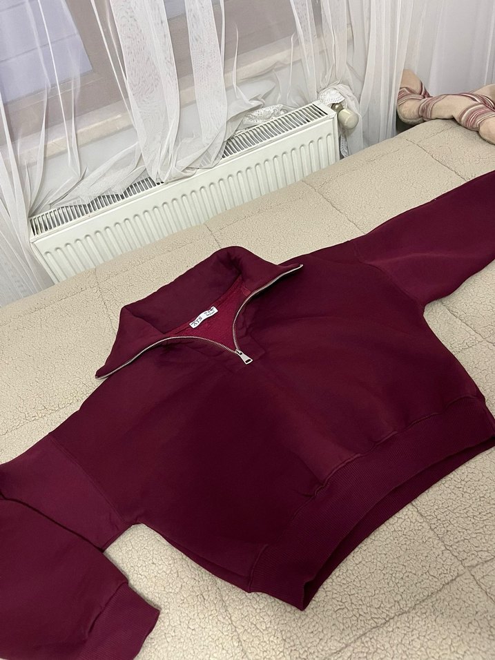 Bordo renkli, fermuarlı yüksek yakaya sahip, uzun kollu kadın sweatshirtü. Yumuşak ve sıcak fleece kumaştan, bol kesim ve normal boyda, günlük ve sokak stili için uygun.