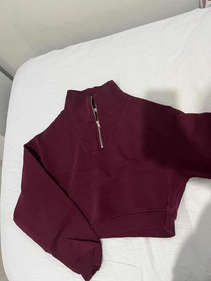 Bordo renkli, fermuarlı yüksek yakaya sahip, uzun kollu ve vücuda oturan sweatshirt. Yumuşak ve sıcak kumaştan üretilmiş, günlük kullanıma uygun sade sokak stili.