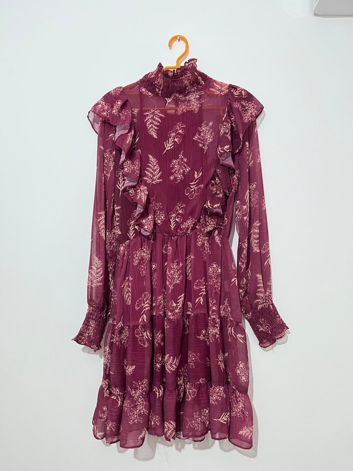 Bordo renkli, uzun kollu ve yüksek yakalı kız elbisesi. Fırfır detayları ve bol kesimiyle bohem tarzı yansıtıyor, koyu tonlu batik desenlidir.