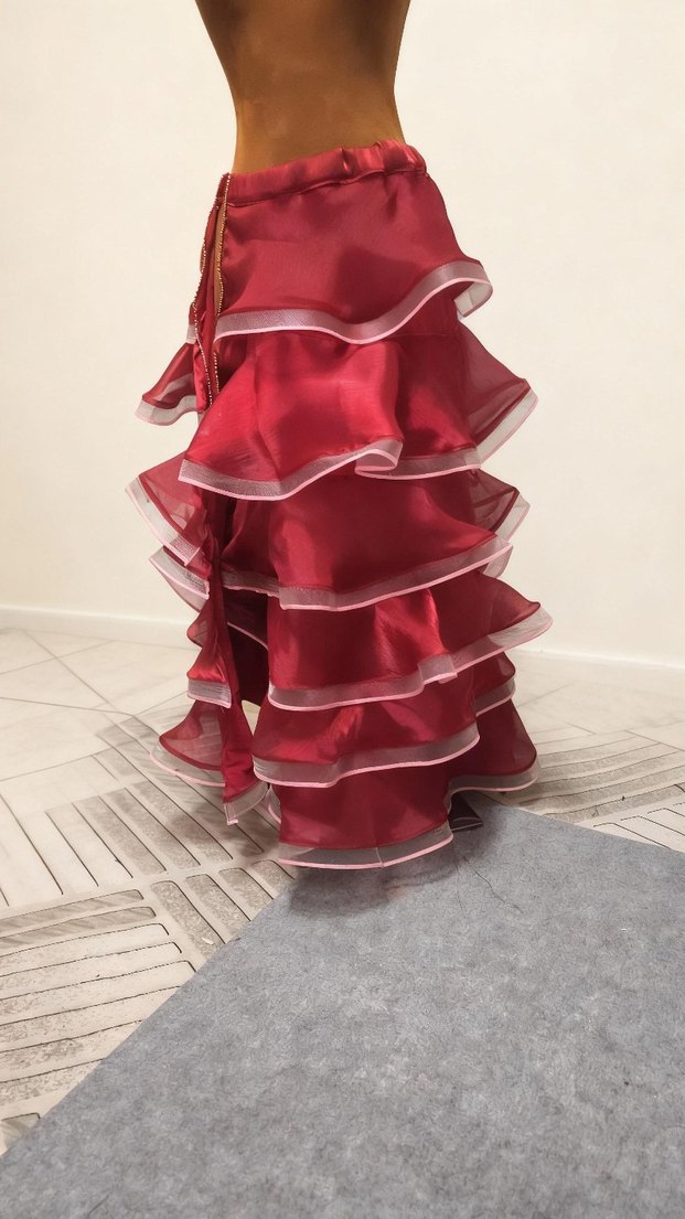 Bordo renkli, parlak sentetik kumaştan yapılmış, nakışlı detaylara sahip etek Bol kesim, kat kat fırfır .sağ bacakta yirtmac detayı