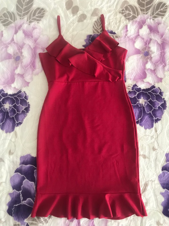 Bordo renkli, ince askılı ve fırfır detaylı, vücuda oturan elbise. 1 kez giyildi