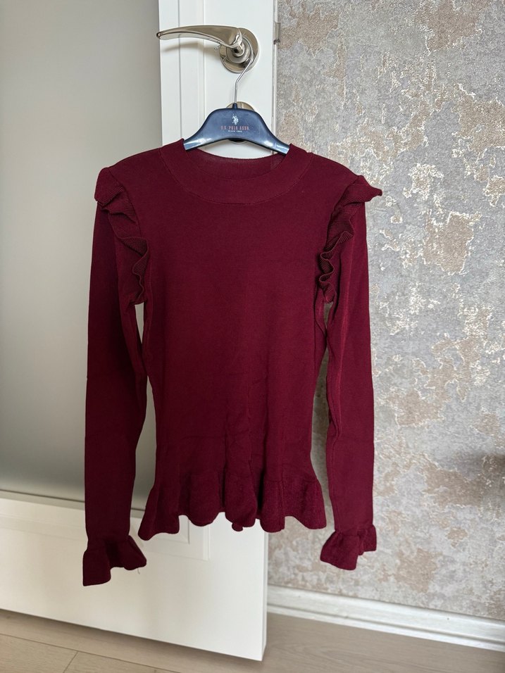 Bordo renkli omuz kol ve etek kısmı fırfırlı ince trikodur.Etek boyu 57 cm koltuk altı 35 cmdir. Esnek bir kumaştır.