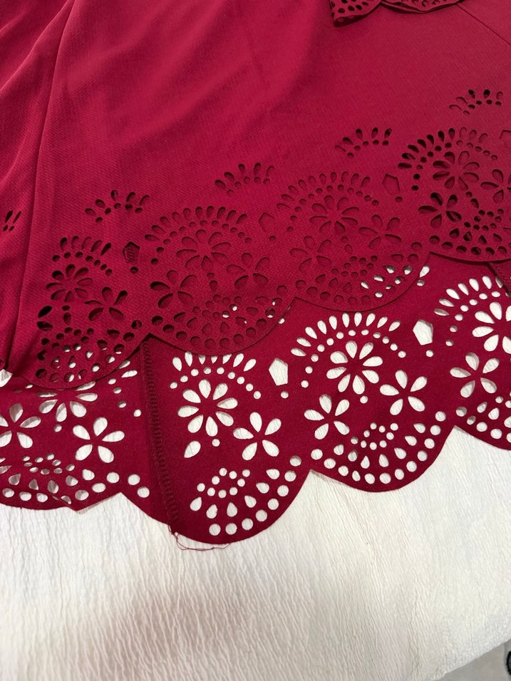 Bordo renkli, fırfırlı kadın şalı. Bohem tarzda, çiçek desenli kesme detaylara sahip, sentetik kumaştan yapılmıştır.