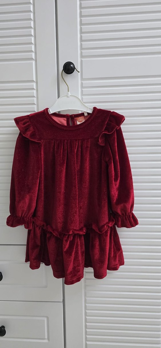 Bordo renkli, uzun kollu ve fırfırlı tasarıma sahip, yumuşak ve rahat kumaştan üretilmiş bol kesim elbise. Bandanasiyla beraber gönderilecektir.