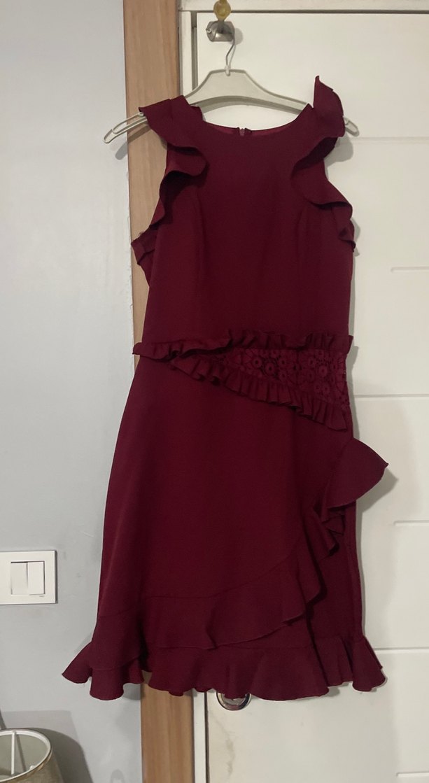Kolsuz, yüksek yakalı bordo midi elbise, vücuda oturan kesimi ve romantik görünüm için şık fırfır detaylarıyla. Bir kere giyildi