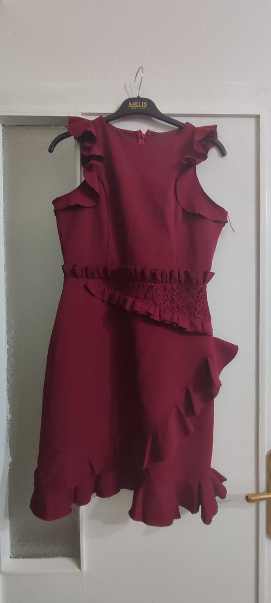 Bordo, straplez, fırfırlı detaylara sahip, desenli ve diz boyu uzunluğunda, vücuda oturan abiye elbise. Romantik akşamlar için uygundur.