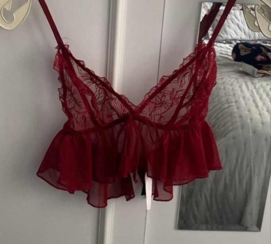 Bordo renkli, V yakalı, askılı, nakışlı ve fırfırlı gotik tarzda, vücuda oturan büstiyerdir. Sentetik yumuşak kumaştan yapılmıştır, romantik akşamlar için uygundur.