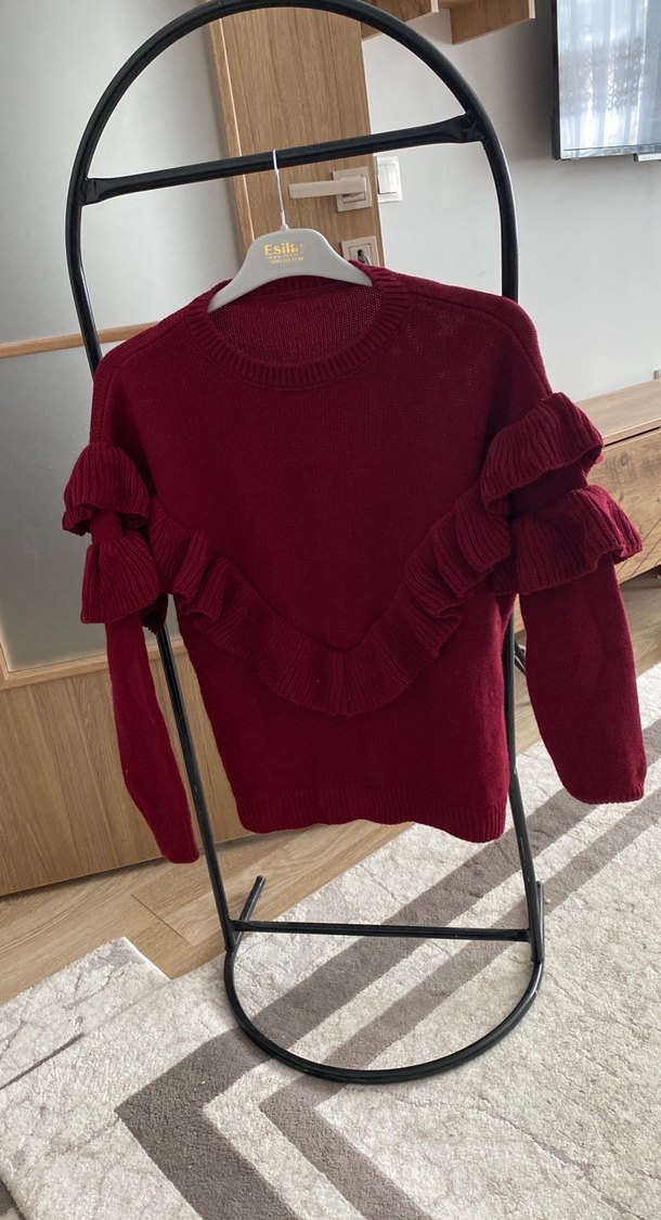 Bordo renkli, yuvarlak yaka ve uzun kollu triko kazak. Önde ve kollarda fırfır detayları bulunur. Salaş ve kısa kesimiyle bohem tarzına uygundur. Standart beden