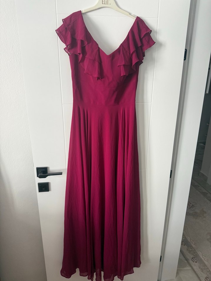 Bordo renkli, V yakalı ve fırfırlı detaylara sahip uzun, kolsuz abiye elbisedir. Modern klasik vintage tarzında, rahat kesimdir ve düğün için uygundur. Fiyatı çok uygun alanın işine yarasın evde duracağına