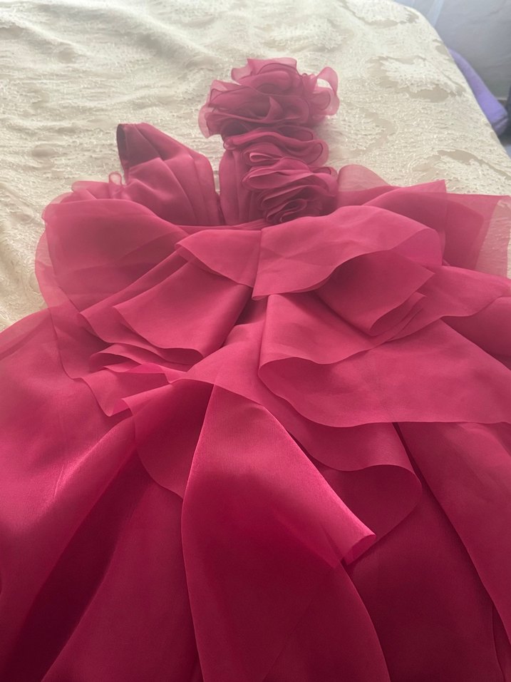 Bordo renkli, tek düze olmayan uzun kadın abiye elbise. Kayık yaka ve ince askılı, kat kat fırfır detaylarla modern ve vücuda oturan tasarım.