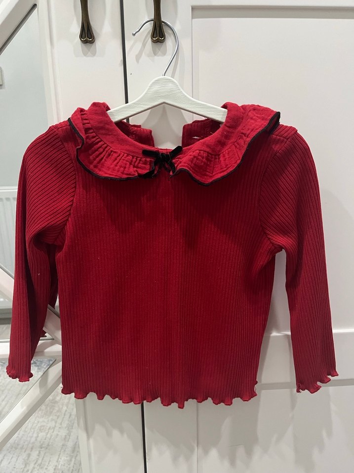 Bordo renkli, uzun kollu ve yakası fırfırlı, vücuda oturan triko kız bluzudur.