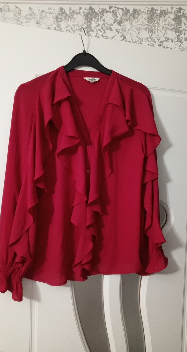 koyu vişne rengi uzun kollu ve fırfırlı detaylı V yaka bluz. Rahat kesim ve parlak, ipeksi kumaştan yapılmıştır. Ofis kullanımı için uygundur. rengi kırmızı değil bordo da değil ikisinin ortası çok güzel bir renk