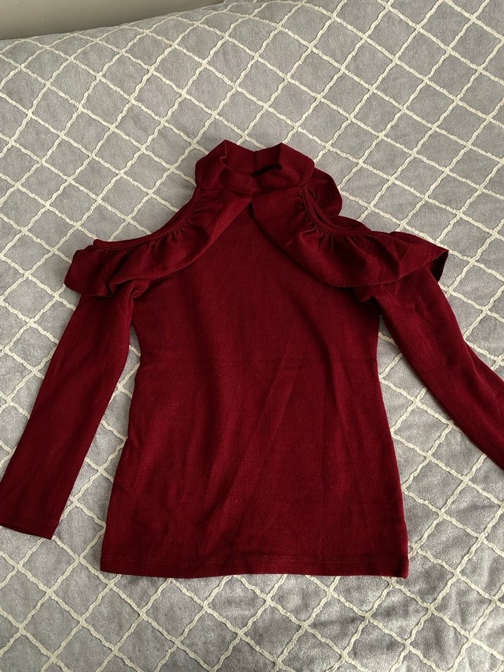 Bordo renkli, yüksek yakalı ve fırfır detaylı uzun kollu, vücuda oturan kadın kazak. Yumuşak ve sıcak kumaştan, günlük kullanıma uygun.