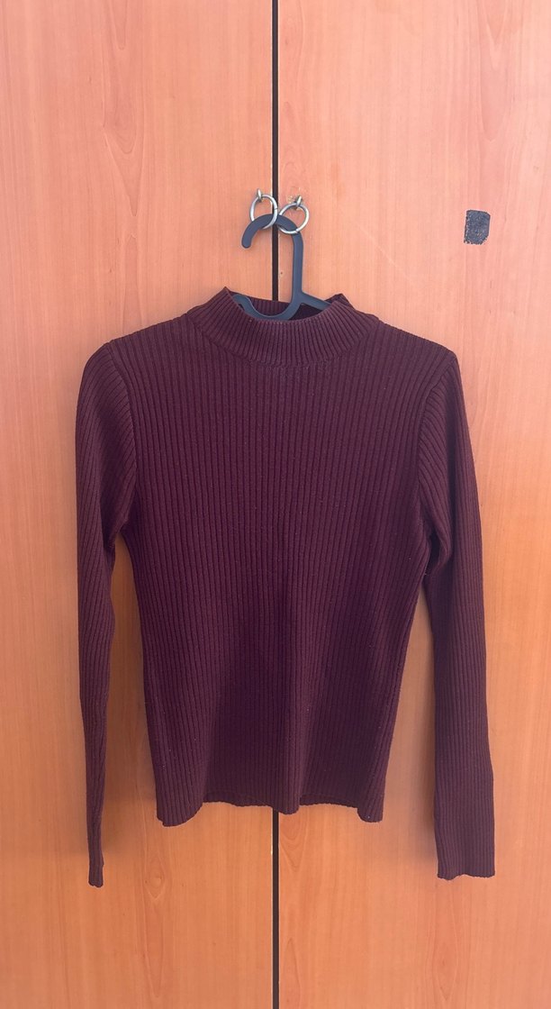 Fitilli bordo boğazlı kadın kazak, uzun kollu ve midi boyda. Triko kumaştan, minimalist tarzda günlük kullanıma uygun.