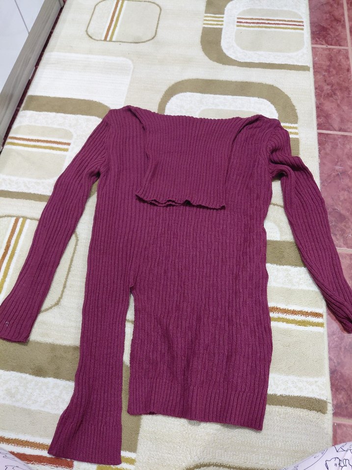 Bordo renkte, boğazlı ve uzun kollu, fitilli örme kadın triko. Normal midi boyunda, sade ve rahat tasarıma sahip.