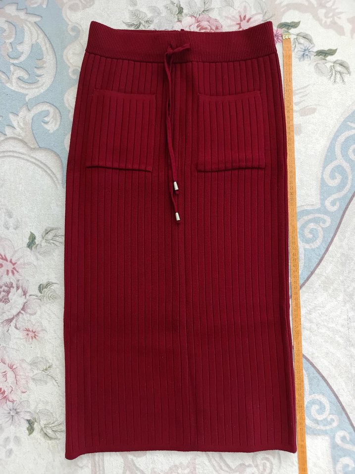 Belinde lastik var, etek iyi esniyor ve standart bir şekil alıyor, örgü kalın ve sulu bordo, çok az giyildi, leke veya kusur yok. Herhangi bir sorunuzu cevaplayacağım..