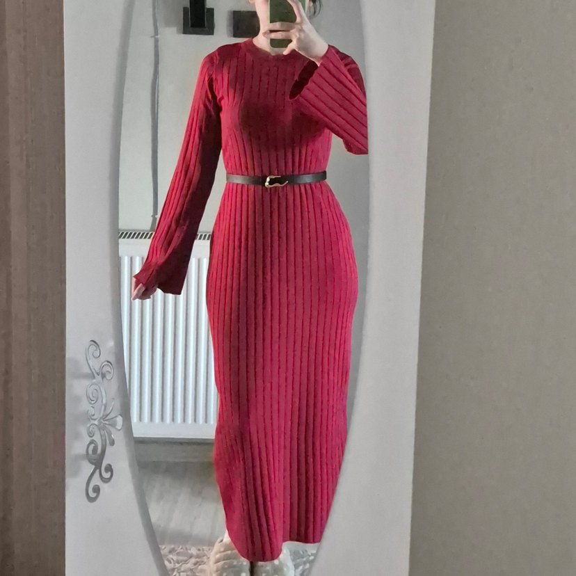 Kemeri dahil değil. Bordo renkli, yüksek yakalı ve uzun kollu, fit kesim örme uzun elbise. Desensiz tasarımıyla günlük kullanıma uygun rahat ve şık görünüme sahiptir.
