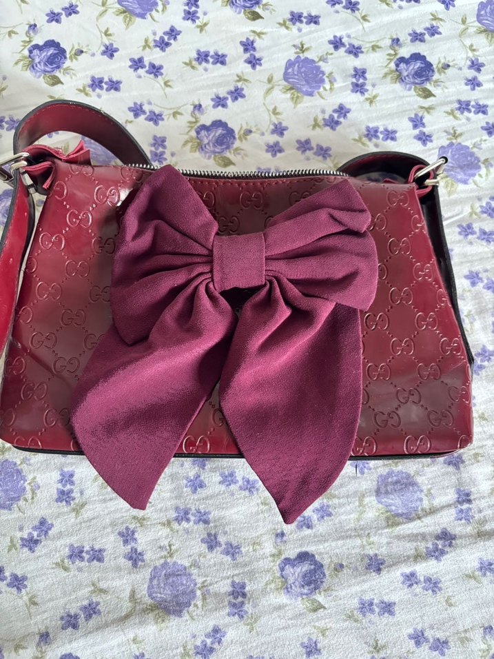 Bordo renkli, büyük fiyonk detaylı ve nakış desenli toka Parlak sentetik kumaştan, klasik zarafet ve gotik tarzı bir arada sunar.