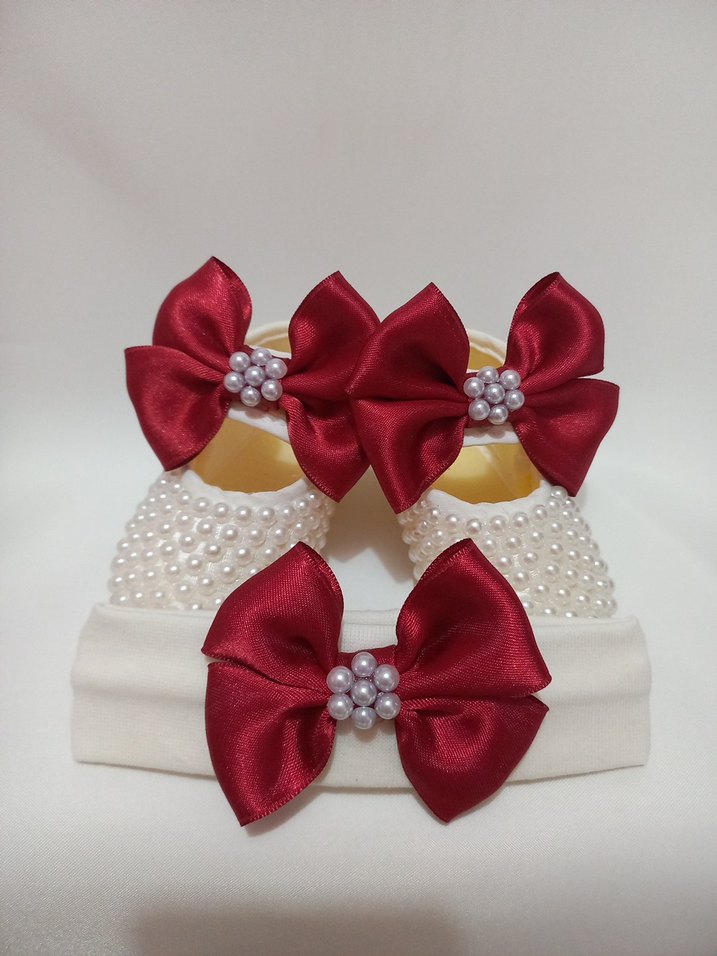 İnci işlemeli, saten bordo fiyonklu kız çocuk özel ayakkabısı ve uyumlu taç, klasik zarif tarzda. Taban ölçüsü opsiyoneldir Kurdele rengi opsiyoneldir