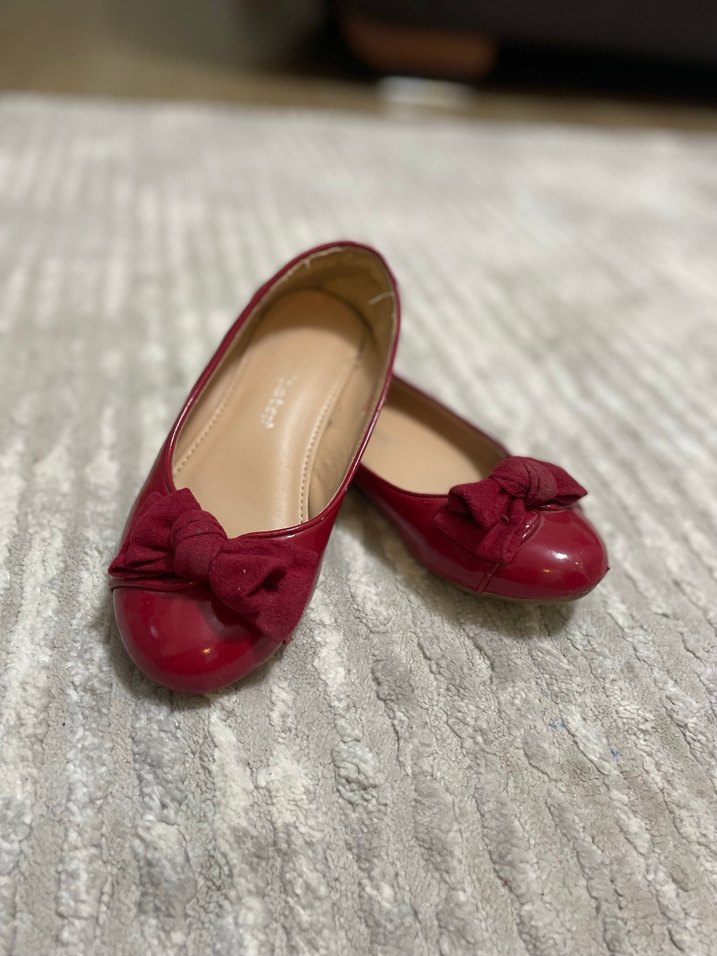 Bordo renkli, lastik tabanlı kız babetleri, fiyonk detayıyla klasik ve modern tarzı birleştirir.
