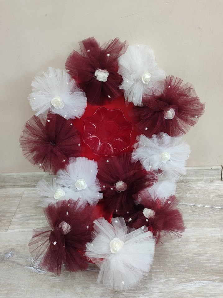 Bordo ve beyaz renklerde, inci ve çiçek detaylı fırfırlı sentetik kumaş kına sepeti bohem avant-garde tarzı için uygun.