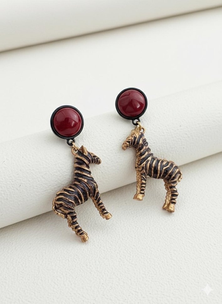Küçük boy, bordo üst kısmı ve detaylı zebra figürlü sallantısı ile cesur, bohem tarzı yansıtan küpeler.