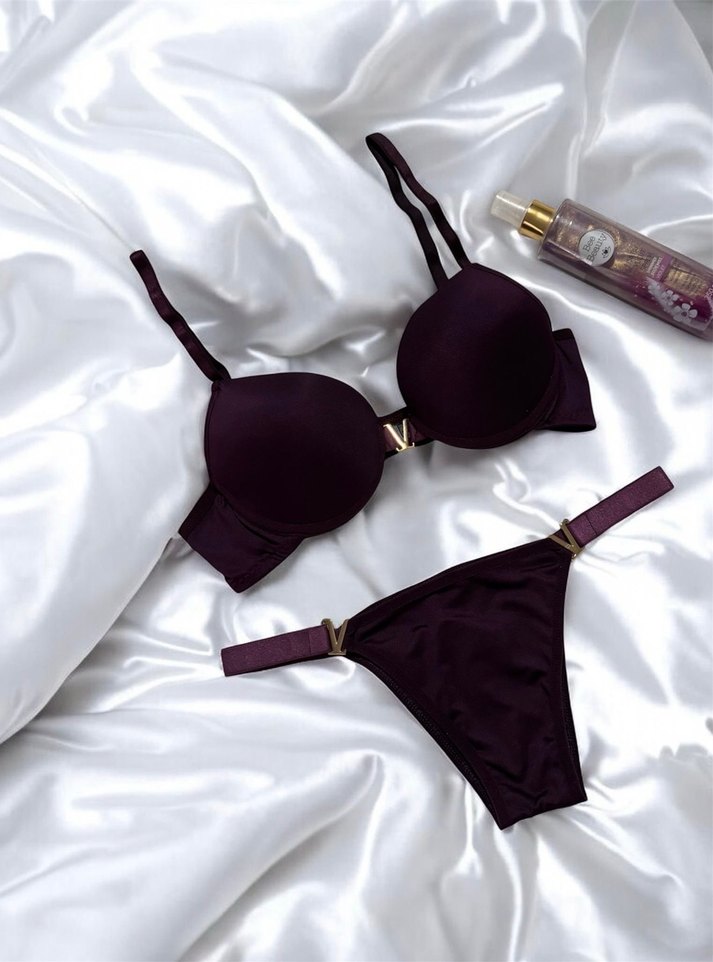 Mürdüm goth tarzında minimalist sütyen takımı, ayarlanabilir askılar ve altın detaylarla sade ve şık bir görünüm sunar.