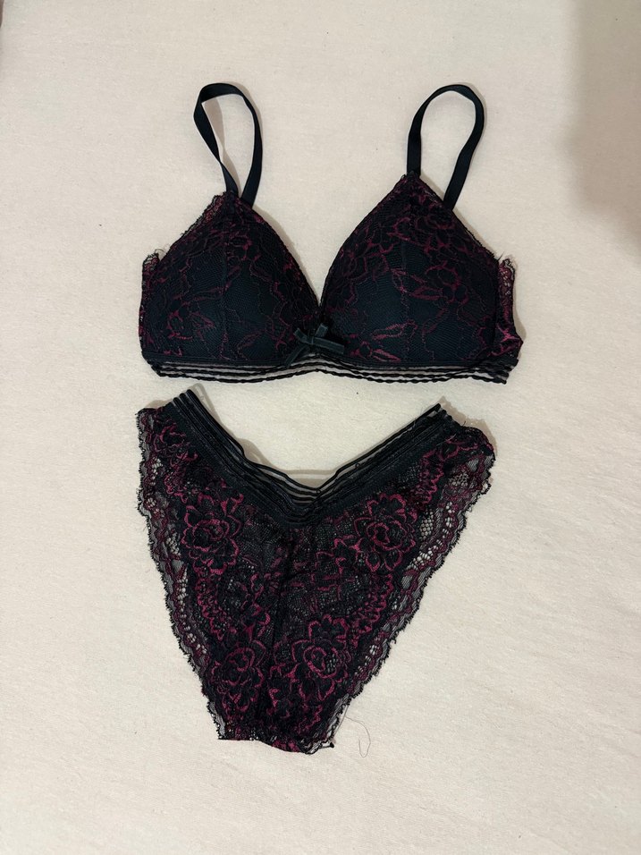 Bordo ve siyah renklerde gotik tarzda dantelli sütyen ve külot takımıdır. Zarif ve şık bir görünüm sunar. Üst beden 80/B . Hiç giyilmedi . Alt kısımda bi deforme var . Aldığımda öyleymiş .