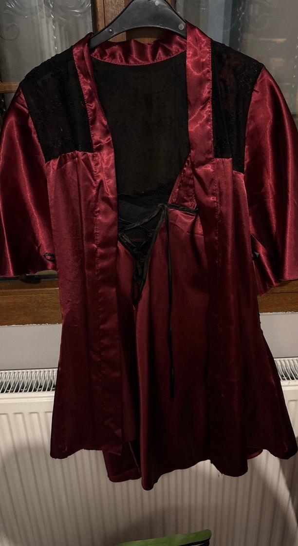 Bordo renginde, gevşek kesim ve askılı kollu, gotik tarzda midi uzunlukta kadın sabahlık. Düz ve parlak dokusu vardır. S/M uyumlu