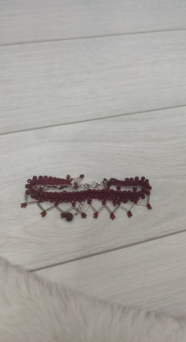 Bordo renkte gotik tarzda, nakışlı ve boncuk detaylı kolye. Normal midi uzunluğunda, bohem ve retro havası ile romantik akşamlar için uygun.