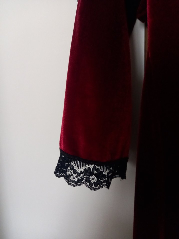 Bordo renkte, uzun kollu ve dantel işlemeli gotik tarzda, vücuda oturan uzun kadın elbisesi.