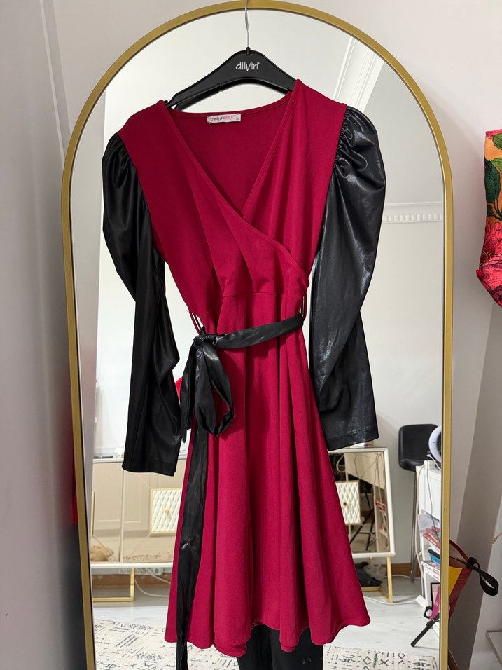 Bordo renkte, drapeli V yakalı ve bol kesim uzun elbise. Gotik tarzı siyah askılı kollar ve sentetik kumaşla buluşturuyor.