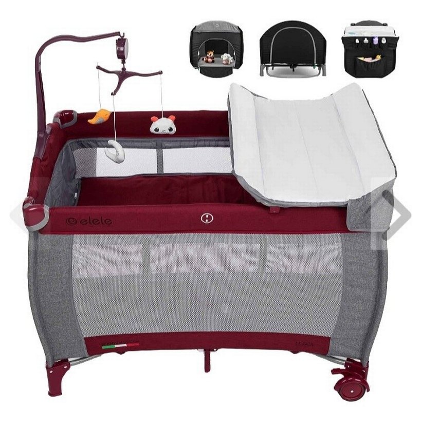 Bordo ve gri renklerde, hava alan file yanları, yumuşak yatak ve asılan oyuncakları olan bebek oyun parkı yatağıdır. Değişim masası ve hareket kolaylığı için tekerlekler bulunur . elele markadır fotoğraftaki gibi aynısı, temiz ve sorunsuz.