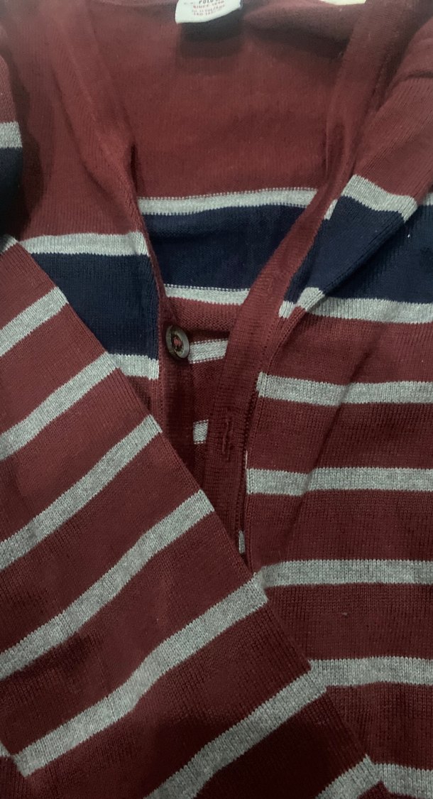Bordo ve gri çizgili, pamuklu uzun kollu erkek hırka. Düğmeli ve yakalı, fit kesim ile rahat bir günlük stil sunar.