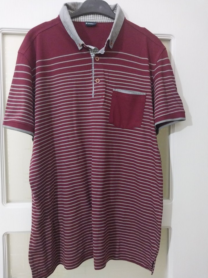 Bu erkek polo tişörtü kısa kollu, düğmeli yakalı ve bol kesimdir. Bordo zemin üzerinde gri yatay çizgiler, ön cep ve yumuşak sentetik kumaş kullanılmıştır. Günlük sokak stiline uygundur.