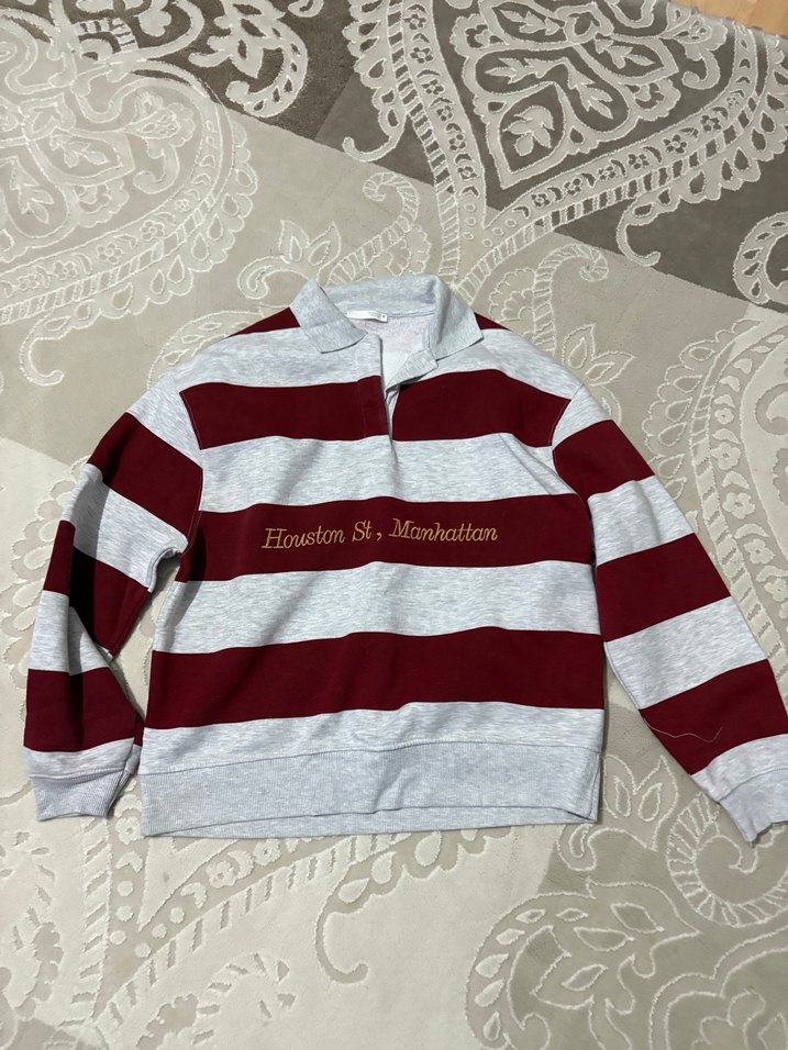 Uzun kollu, bisiklet yaka, bol kesim kadın sweatshirt. Bordo ve gri geniş çizgili, örme kumaştan, "Houston St, Manhattan" baskılı. Günlük sokak stili için uygun.