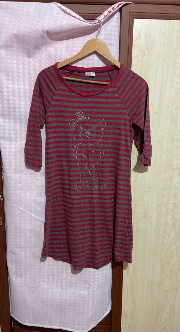 Bordo ve gri çizgili, uzun kollu, yuvarlak yakalı hamile midi elbise. Bol kesim ve örgü dokulu, önünde baskılı ayıcık deseni bulunur. Günlük rahat kullanım için uygundur.