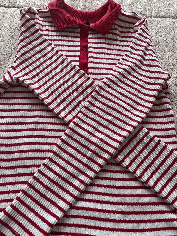 Uzun kollu, yakalı, triko örme kumaştan yapılmış bu kadın kazak, bordo ve gri çizgili, normal boyda ve vücuda oturan kesimde, rahat sokak stiline uygundur.