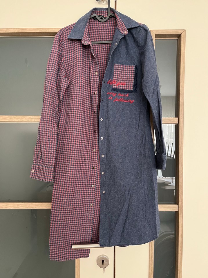 Bordo kareli ve gri denim kumaşların birleşimiyle uzun kollu, düğmeli ve yakalı kadın gömlek elbisesi. Rahat kesim ve baskılı detaylarla günlük sokak stiline uygun.