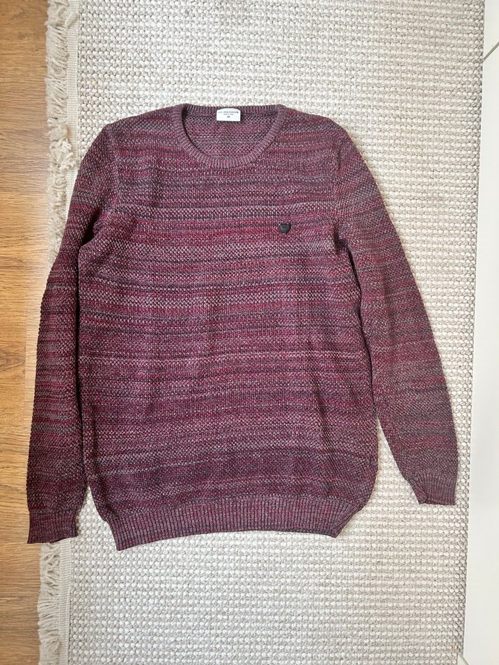 Bordo ve gri tonlarında kravat boyama desenli, uzun kollu, yuvarlak yaka ve bol kesim erkek triko kazak. Rahat ve günlük kullanım için uygundur.
